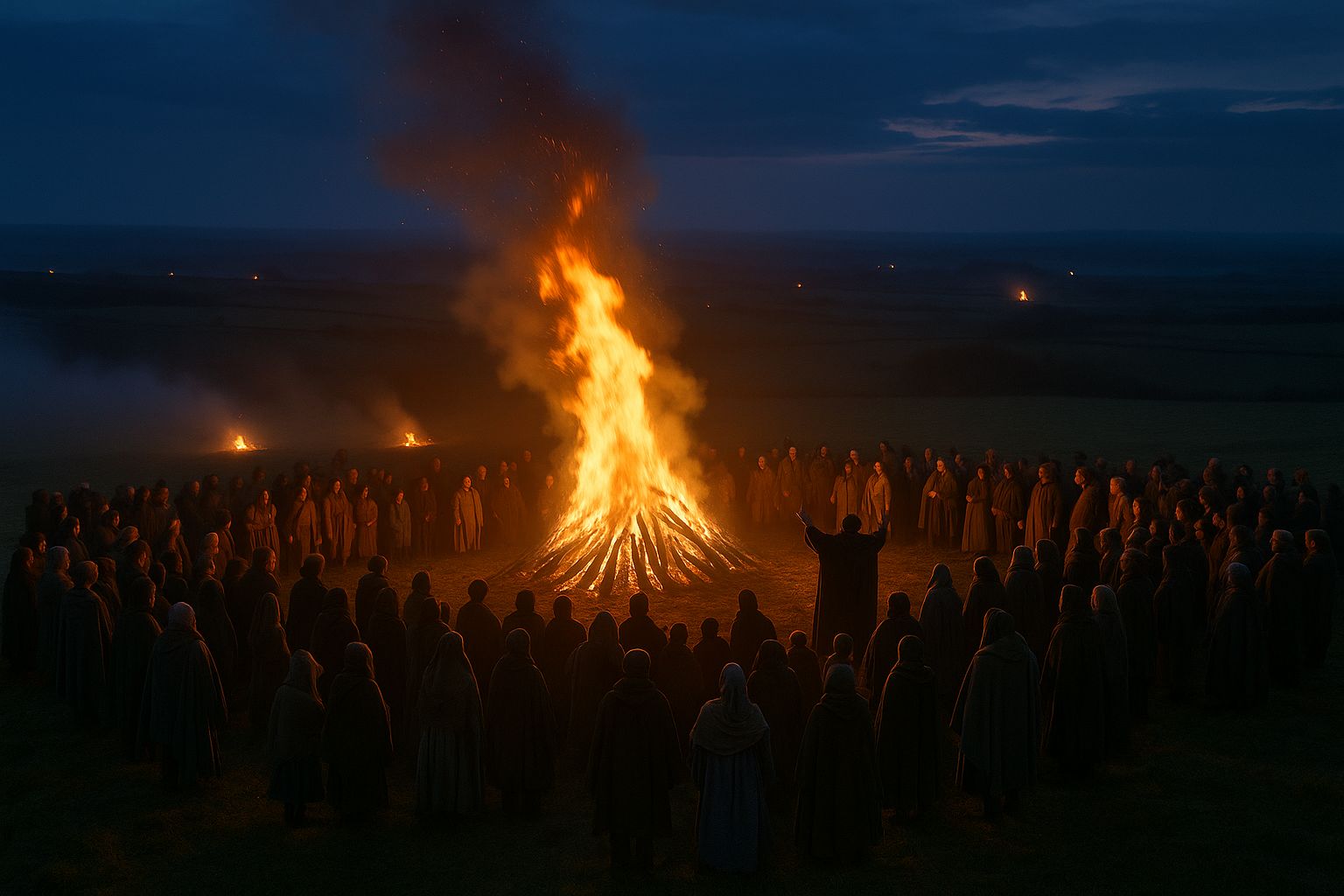 Fires burned on the hilltops that night - not just for warmth, but for protection and renewal. On the Hill of Ward (Tlachtga) in County Meath, great flames once drew whole communities together. From that fire, each household carried a live ember home to relight the hearth, a small glow against the dark. Food was left out for wandering souls, and no door was locked. It was known, without saying, that the dead might wish to visit.